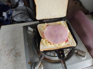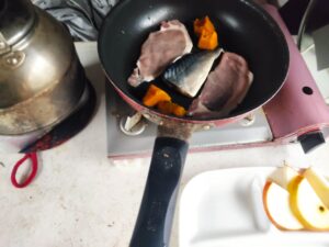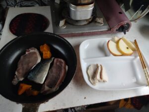 スマホのタイマーが鳴ったら、メスティン+やかん軍団をコンロから下ろしてフライパンを乗せて中火で焼きます。