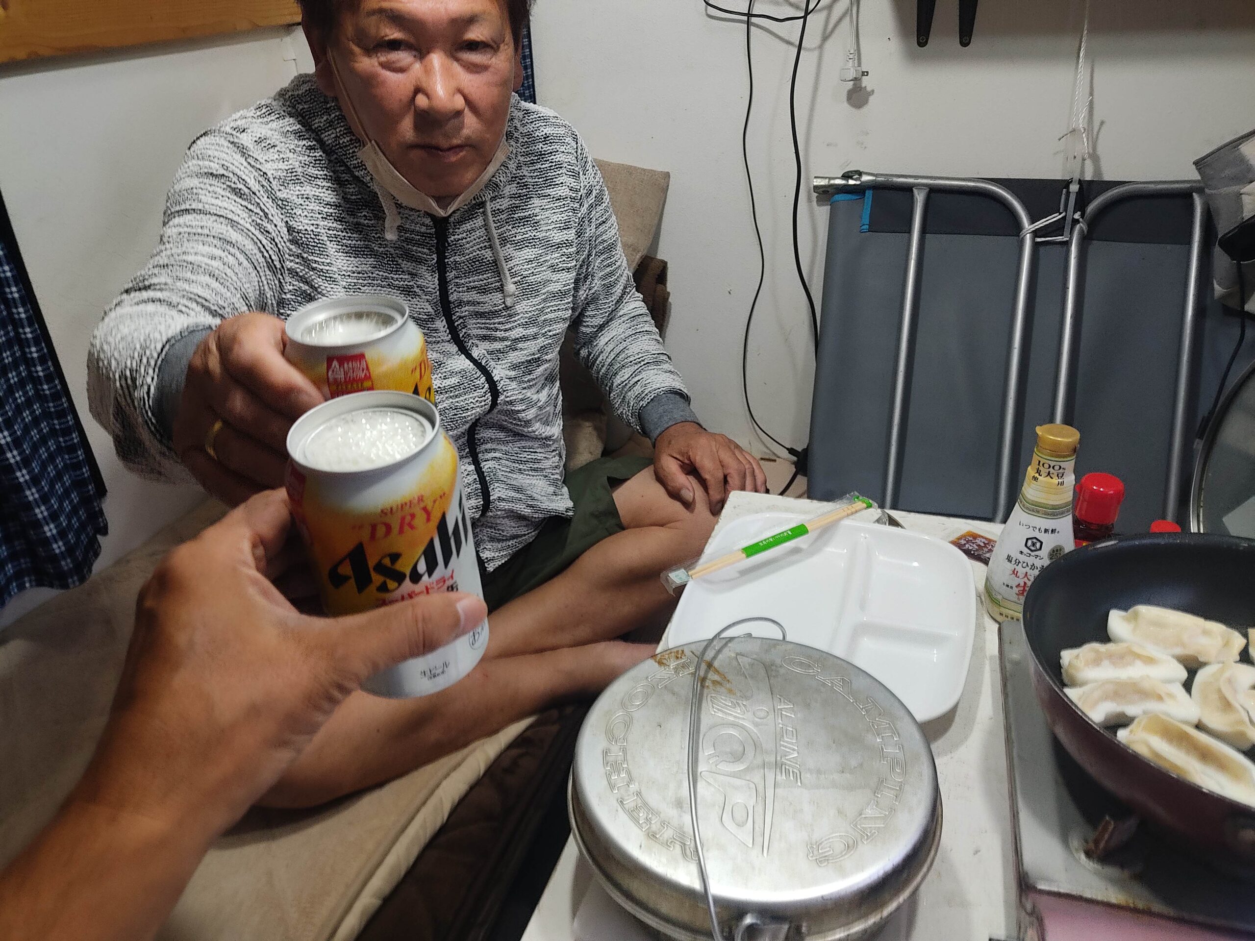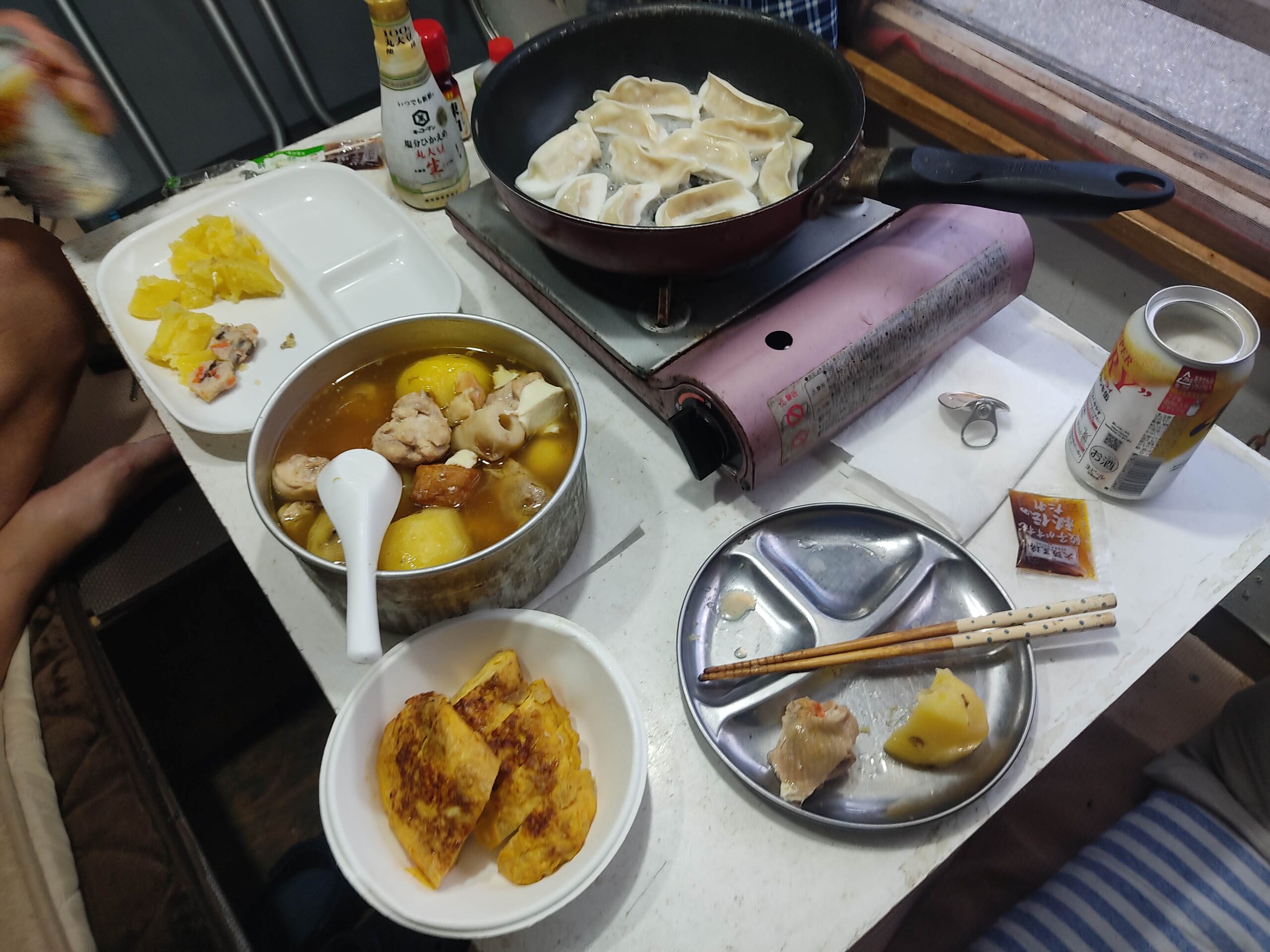 メニューは、太郎ちゃんが木賊温泉で買ってきてくれた大阪王将の餃子と、太郎ちゃんが作って来てくれたタマゴ焼き、