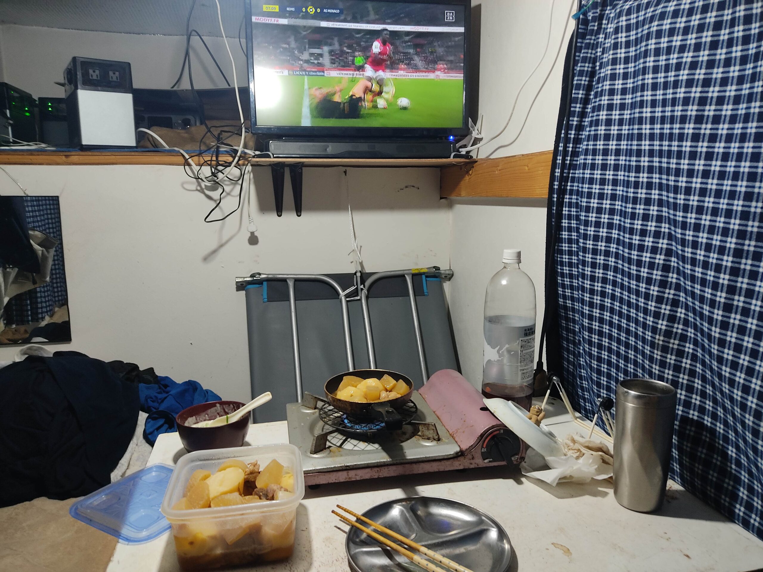 電気事情が豊富になったので、この旅で初めてテレビでサッカー観戦しながら夕食を食べます。