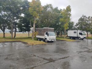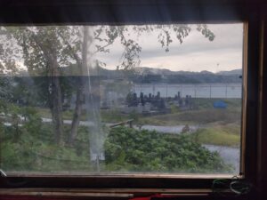 窓の外に写っているのは山ちゃんの車とトレーラーです。