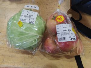 農産物直売所でりんごとキャベツを買い、