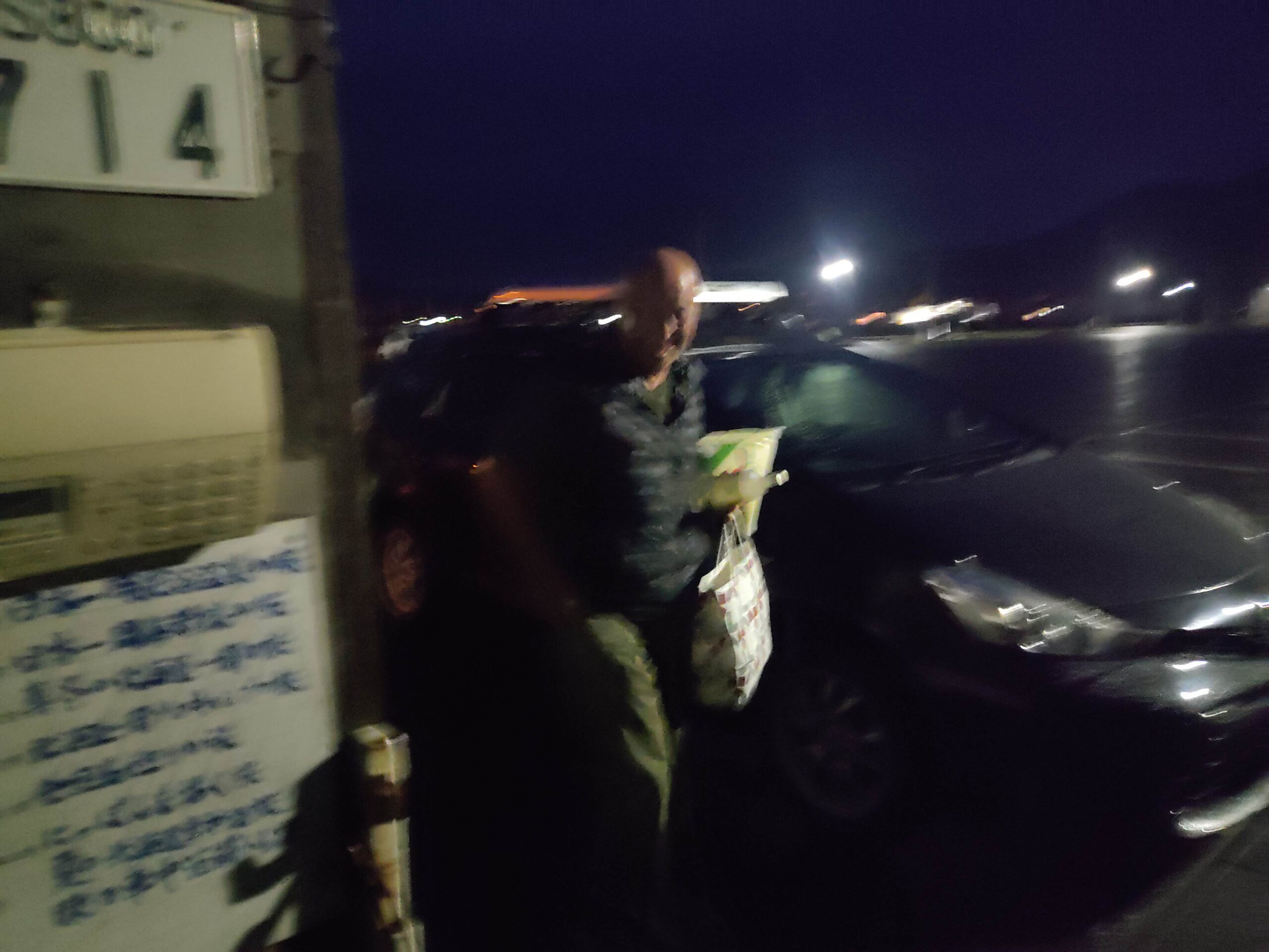 黒い車から荷物を抱えて怪しいオヤジが下りてきました。