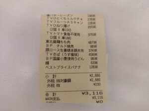 支出:3,116円(スーパー)+300円(駐車料金)=3,416円