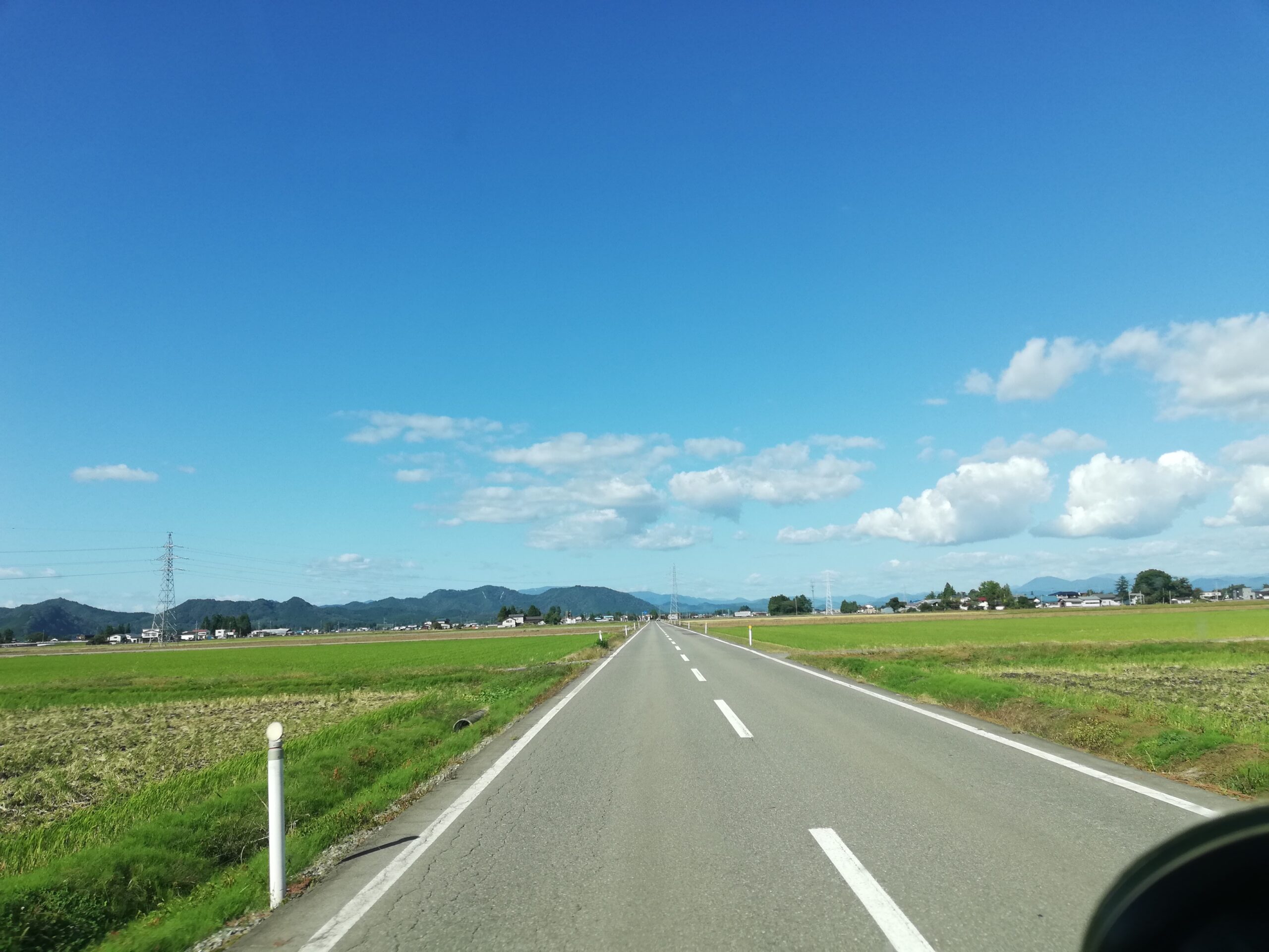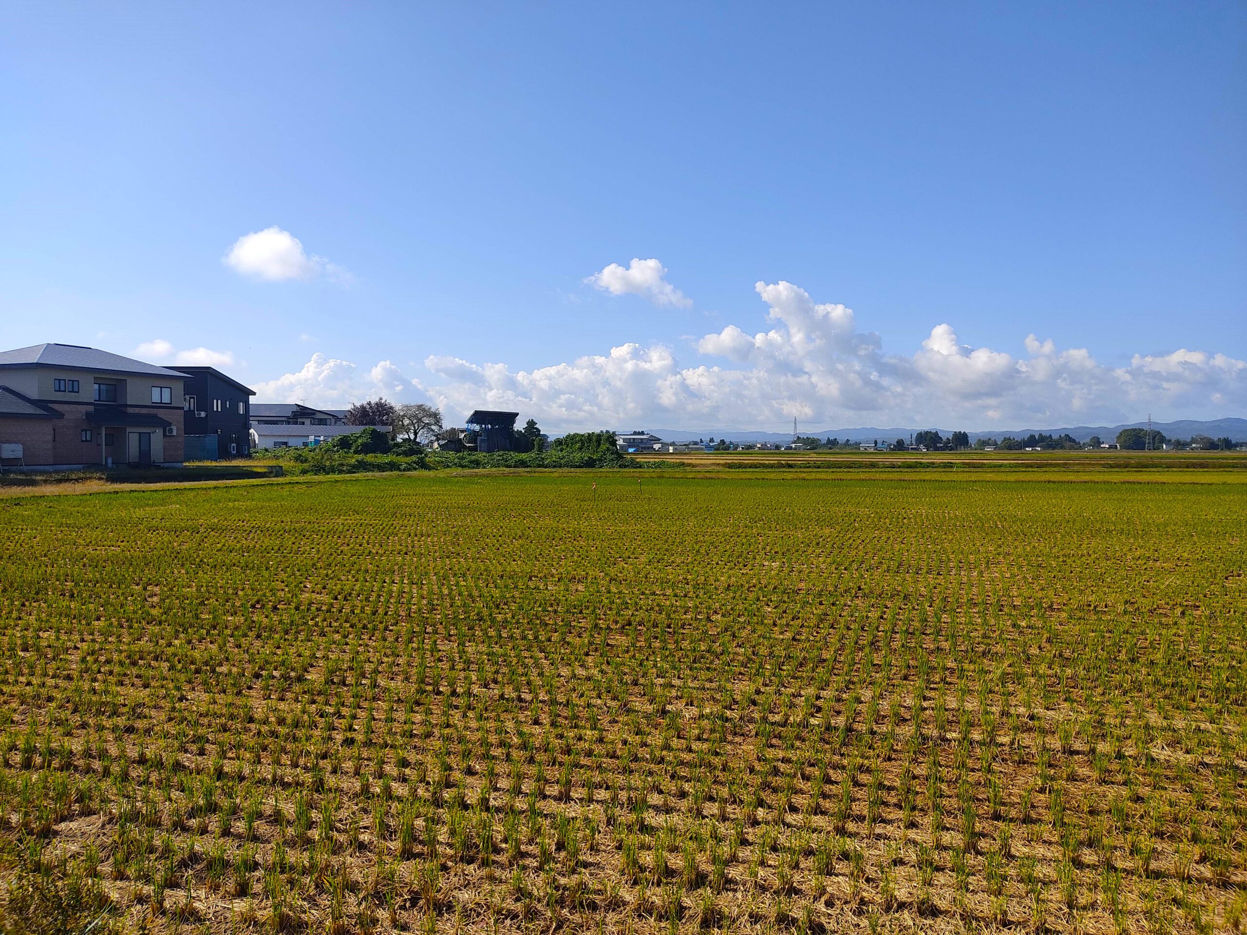 稲刈りの終わった田んぼの上に青空が広がっています。