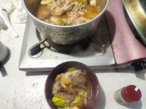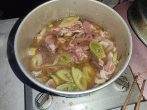 余っていた馬肉の煮込みに、冷蔵庫の肉類を全部入れてうどんを作ろうと思ったのですが