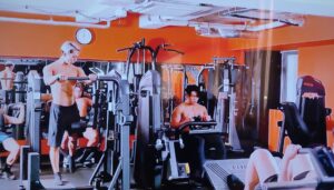 すると筋トレをしていたマッチョたちが手を休め一斉にこっちを見ます(←3人ぐらいしかいないけど)、