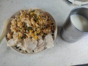 メニューは、豚肉たっぷりチャーハン+鶏胸肉+牛乳。