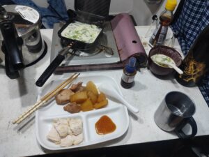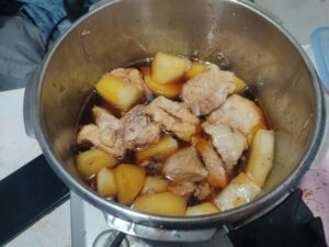 夕食は、圧力鍋に豚肉と大根を入れて醤油、みりん、砂糖、酒で味付けした豚肉と大根の煮つけと、