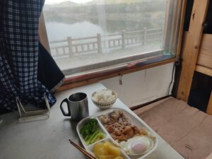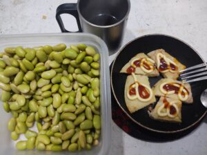 昨日の残りのお好み焼きと秘伝豆でプレ朝食を摂り、