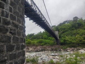 向こうに吊り橋が見えますが、あれは1922年に完成した木曽川を渡る重要文化財の桃介橋です。