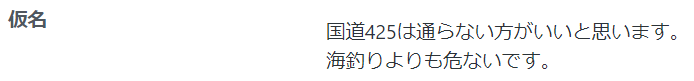 2. たまたまその区間は大したことがないとしても、425号の東側の区間はすさまじいでしょう。和歌山のどこに行くか、読者としてはわからなかったわけなので、親切な忠告である一方、「絶対行くなよ」というダチョウ倶楽部的な振りでもあったような気がします。