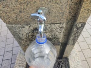 広場の水道で水を補給し、