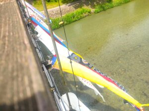下の川に体長数メートルの巨大魚が潜んでいるのです。