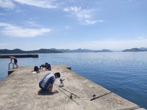 防波堤の先端にいくと、少年たちが釣りをしています。