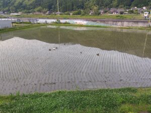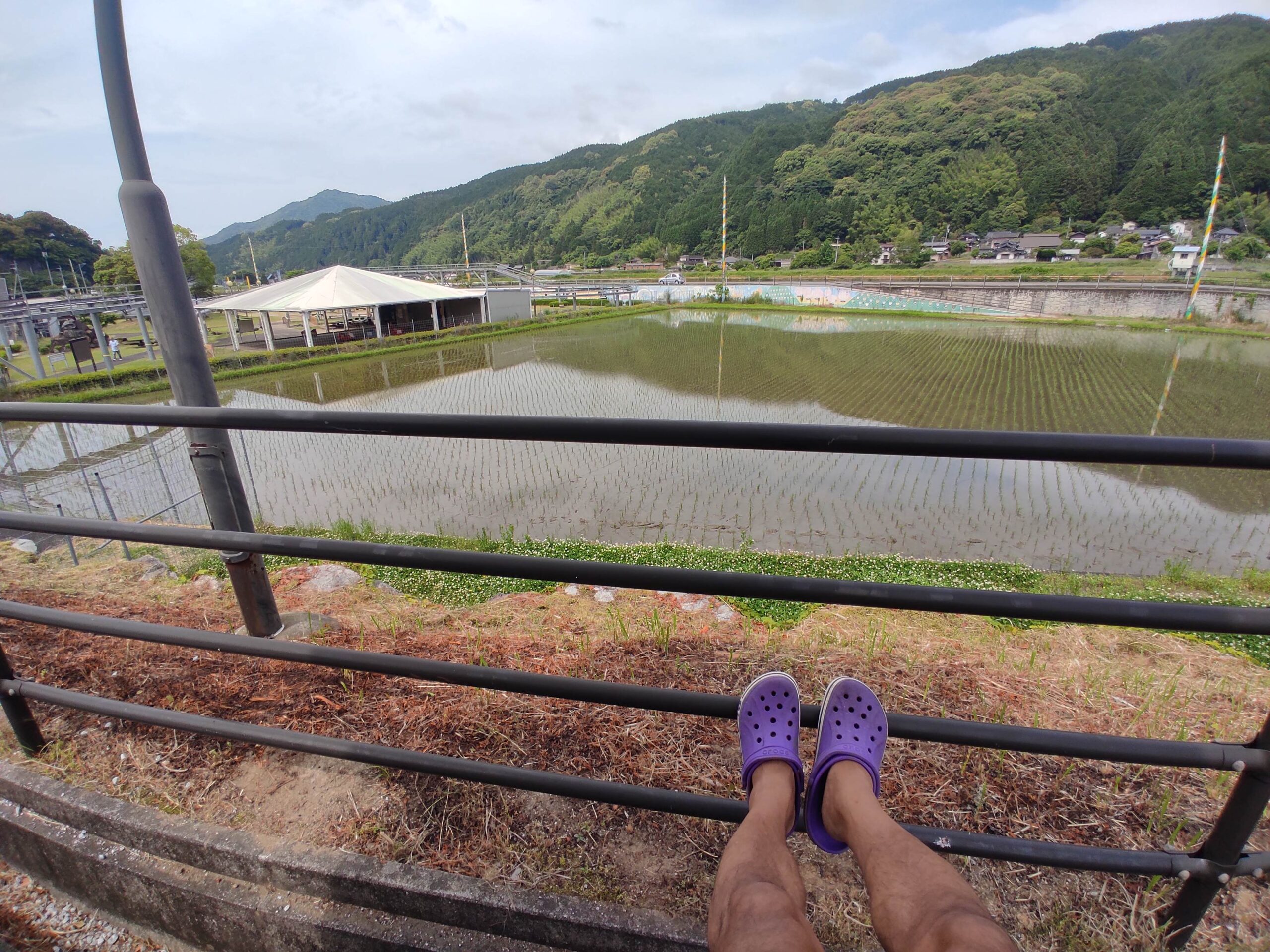 アオリに腰を下ろし、田植えが終わったばかりの田んぼを眺めます。