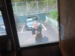 窓の外で怪しいオヤジが写真を勝手に写真を撮ってます。
