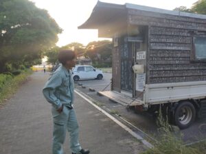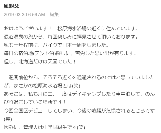 実は5年前の海岸線の旅で熊本の鍋松原海水浴場に泊ったときに、そこの管理人さんに大変お世話になったのですが、