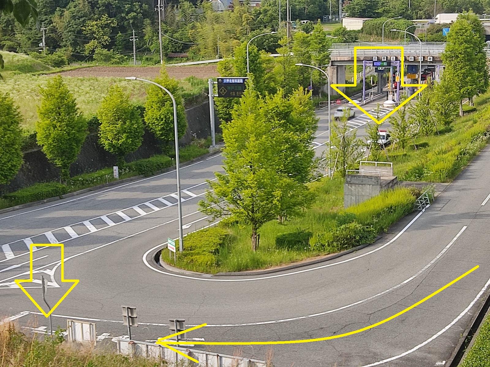 青を降りてすぐ下を見下ろすと料金所付近が見えます。