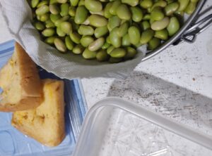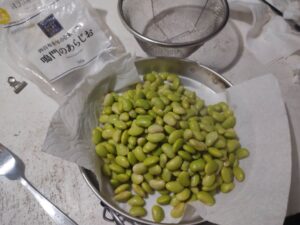 昨日の夕方水に浸しておいた秘伝豆をぐずぐずと10分煮たて
