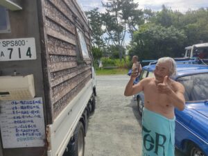 今度は向かいの怪しそうなおとうさんサーファーがやってきました。