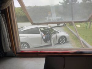 ブログを書いていると、隣のプリウスからYOUが下りてきました。
