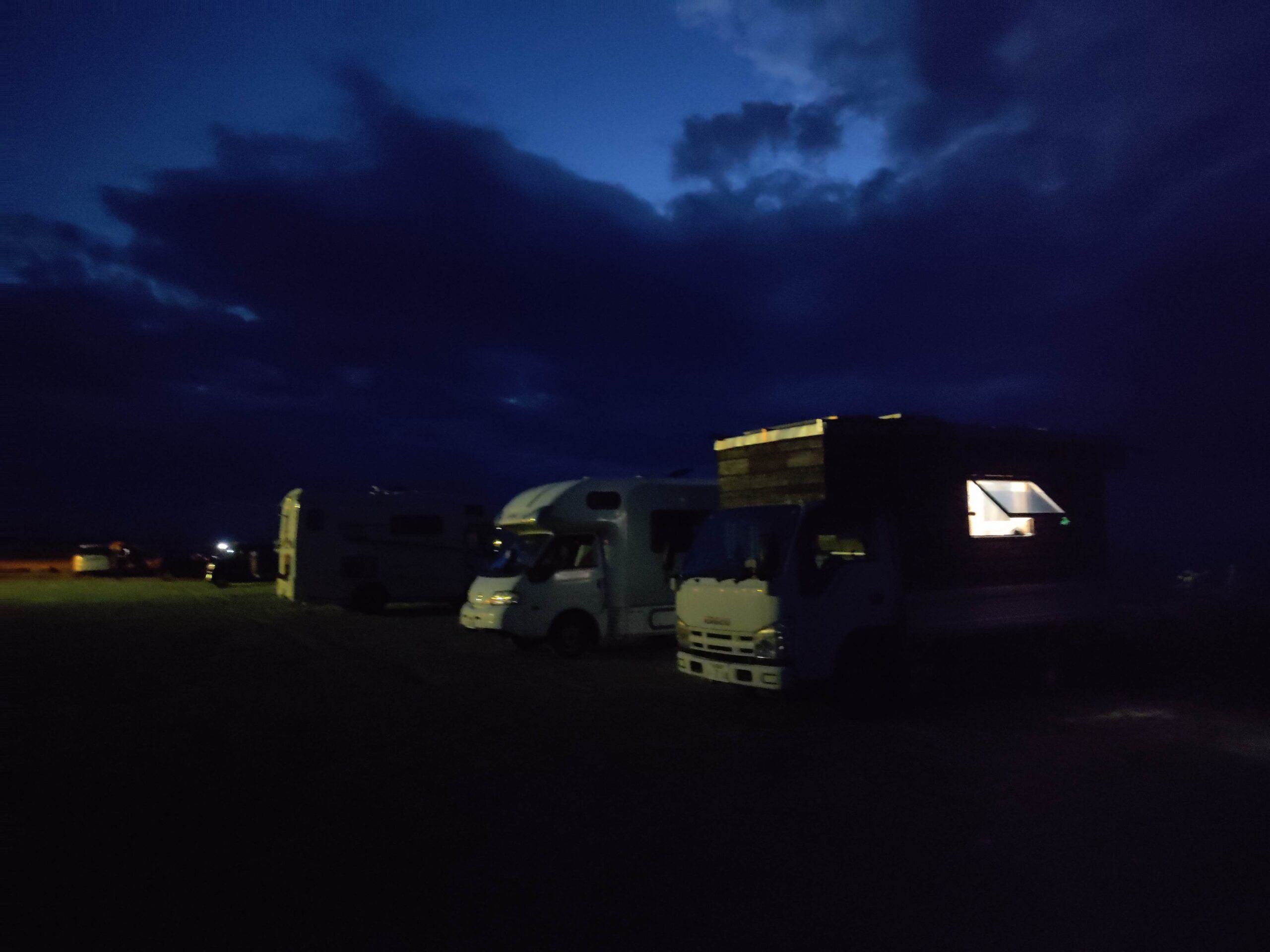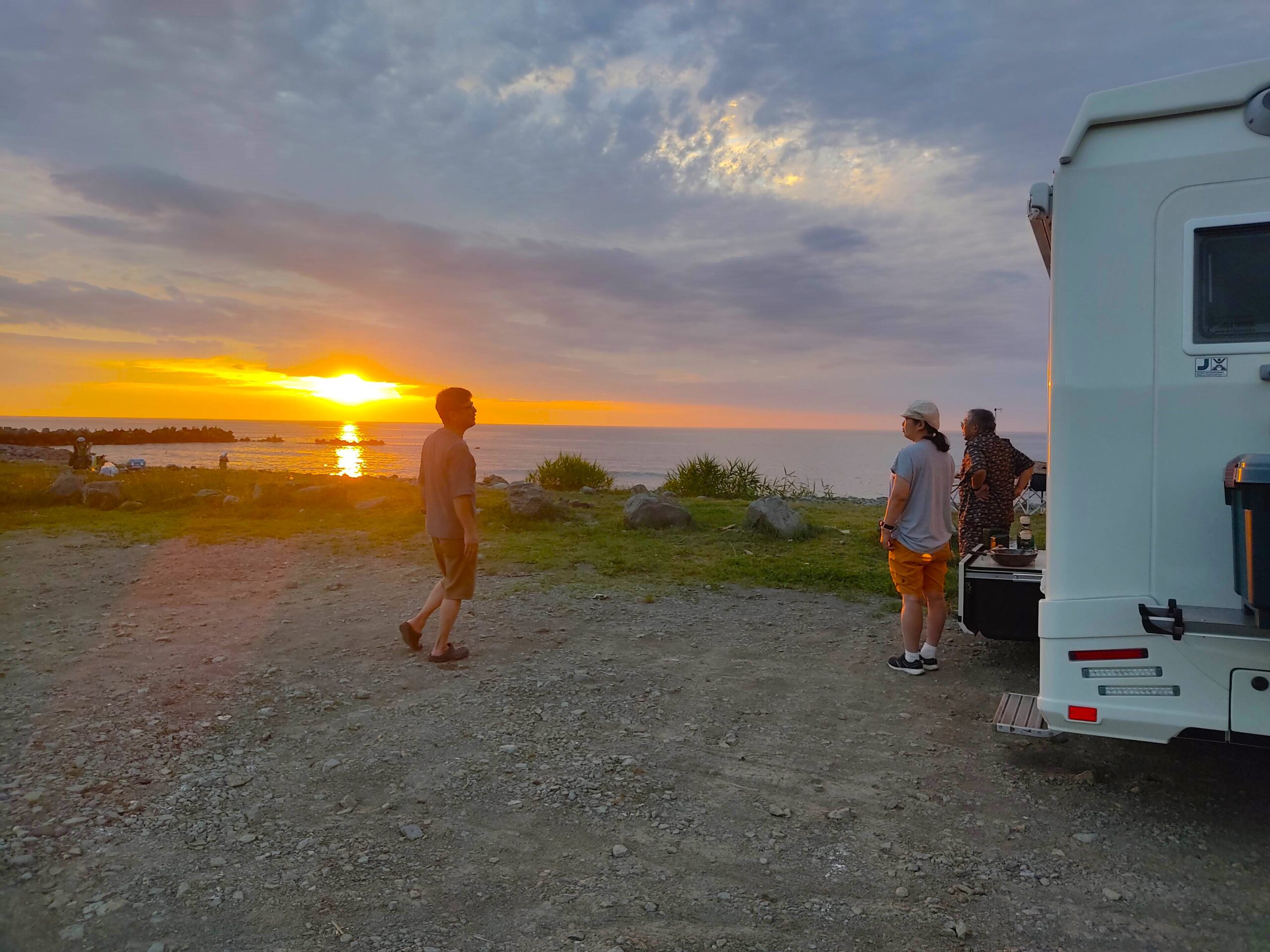 ちょい外に出てお隣のキャンピングカーご夫妻と話をしていると、日本海に日が沈んでいきます。