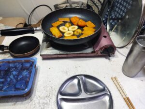 メインは、ミニフライパンで鶏肉を追加したジンギスカンです。
