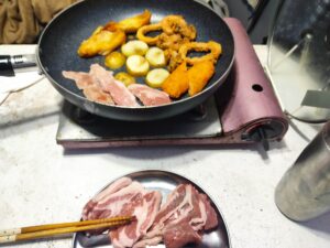 タープの下で炭火を起こして網焼きをしようと思ったのですが、