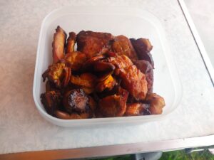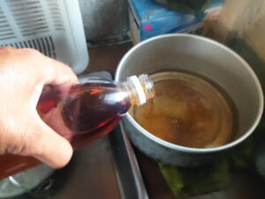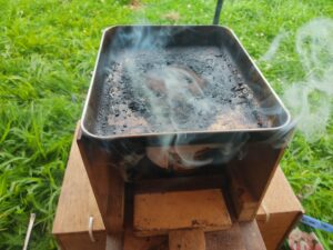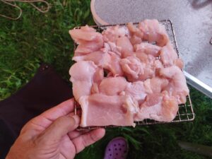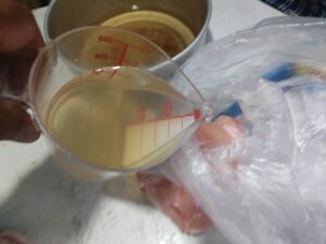 青に戻り、冷えたソミュール液をビニール袋に入れた燻製の食材に流し込み冷蔵庫に保管します。