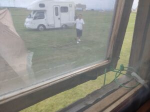 ブログを書いていると、キャンピングカーが停まり誰かこっちにやってきます。