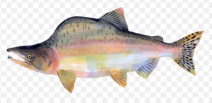 カラフトマス:サケ属の中では小型の種類 goda で全長40-60センチメートル。側線鱗数はサケ・マス類中最も多く、背面や尾びれ、脂びれに黒い斑点があるのが特徴である。Wikipediaより。