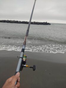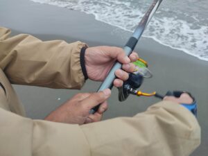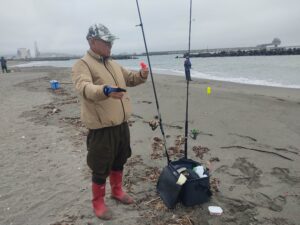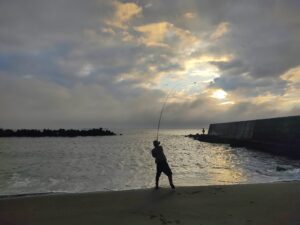 海岸に下りていくと、亜矢ちゃんおとうさんが竿を振っています。
