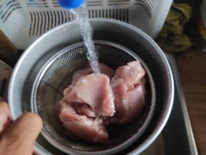 昨日の夜、ソミュール液に浸けておいた燻製の食材を水洗いし、