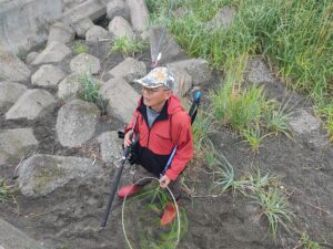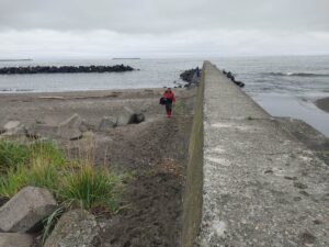 亜矢ちゃんおとうさんがカラフトマスを釣っているカニの爪オブジェの下の海岸に行きます。