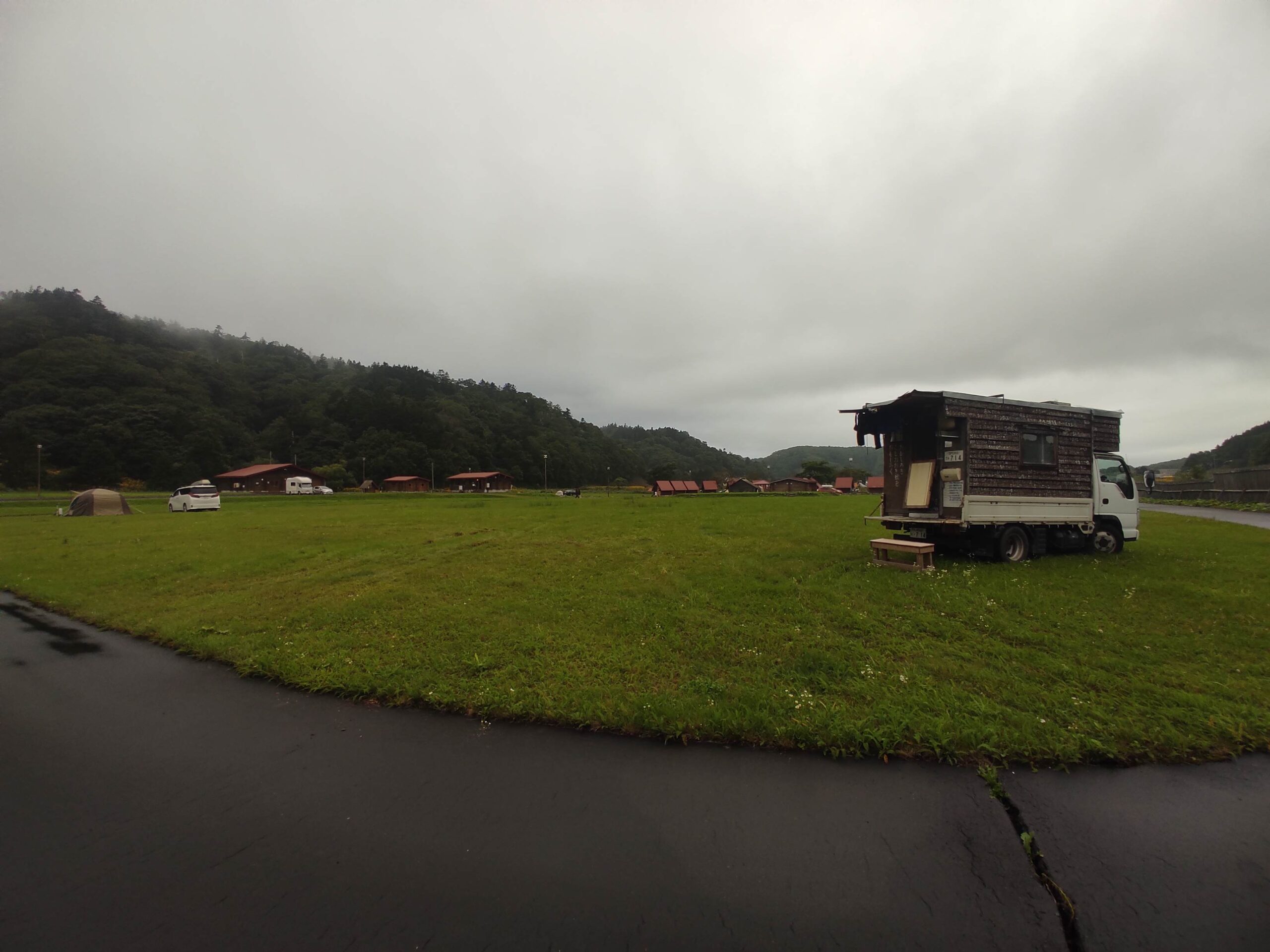 いつものようにキャンプ場全体が見渡せるような一番端に停めます。