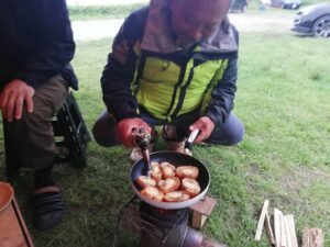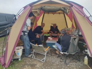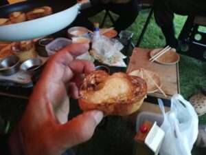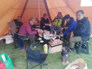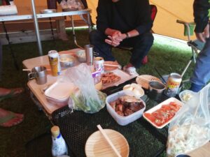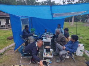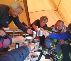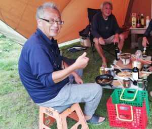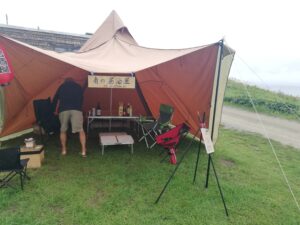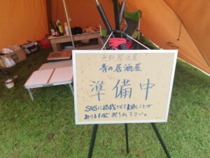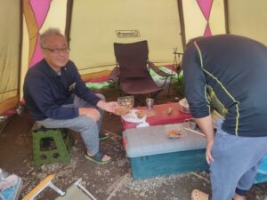 そして、昨日のメンバーや新客が次々と現れ、なし崩し的に今日も青の居酒屋キトウシ野営場店オープンです。