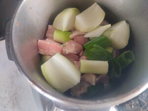 圧力鍋に豚バラと鶏肉、ネギとタマネギを入れて、