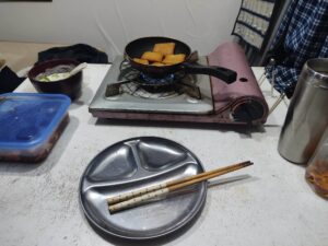 メスティンの上にカレーを置いてご飯を炊きます。