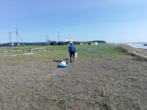 帰ろうとすると、釣り人が重そうな荷物をソリに積んで歩いています。