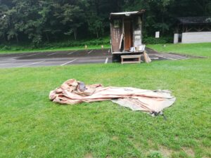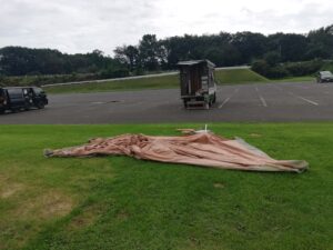 雨で濡れているテントをざっと丸めて青の後ろに詰め込み、