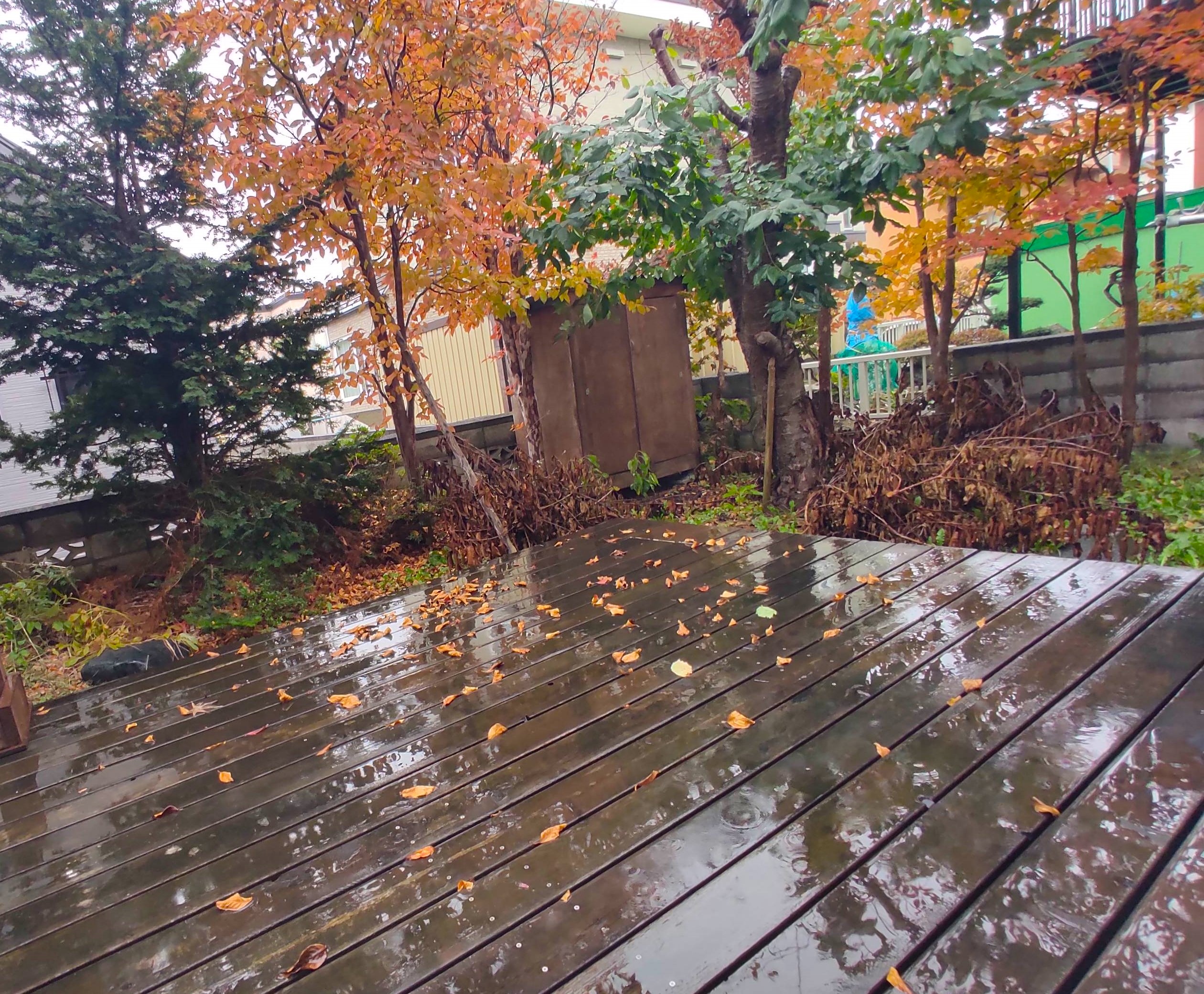 庭の木々も色づき、落ち葉がデッキの上に落ちてきました。
