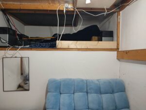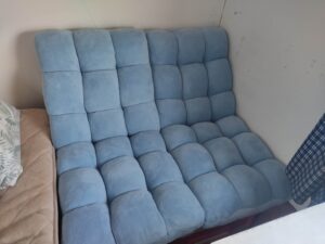 普段はパソコンなどを置いていて、来客があるとベッドのマットを外して半折にして敷いていたのですが、面倒なのとオシャレではないので座椅子を取り付けます。