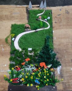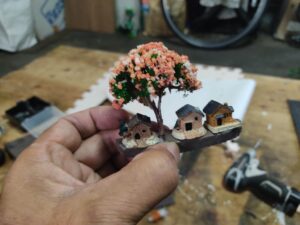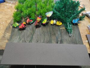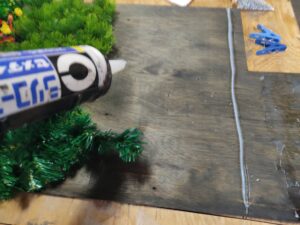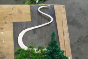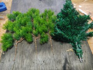 ベニヤの上に松らしき木3本とツリーを並べて固定します。