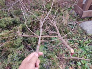 旅から戻ってから切ってそのまま庭に放置してあった木の枝で適当なものを探し、