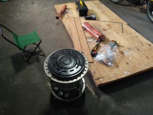 すっかり寒くなってしまったので、昔冬の旅で使ったフジカの灯油ストーブを5年ぶりに引っ張り出して作業します。