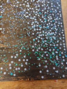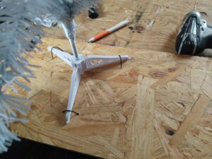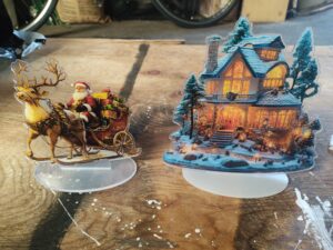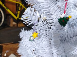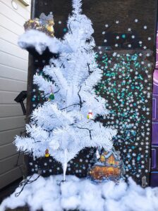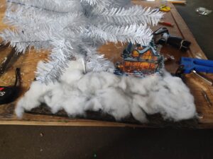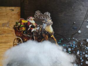 サンタは壁の上の方に取りつけて空を飛んでるイメージにして、綿で下をカモフラージュします。