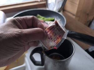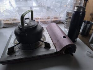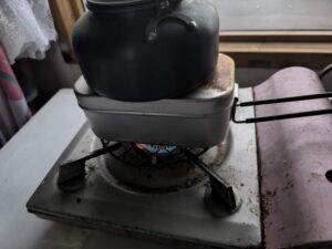 スマホのタイマーを12分にセットし、昨夜から水に浸けておいた米を入れたメスティンの上にみそ汁用の水を入れたやかんを置いて火にかけます。