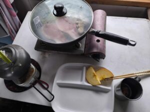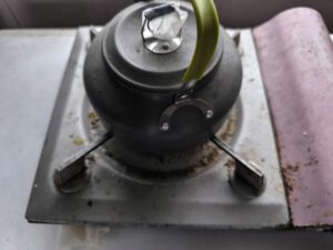 (注)やかんを置かないと吹きこぼれてメスティンの蓋が開いてしまう。