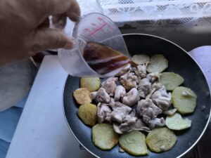 鶏肉を混ぜて焼いてオイスターソースと醤油と酒を入れます。