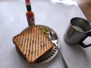 皿の左上のは昨夜の余ったメバチを醤油に漬けて冷蔵庫の中に入れといたものです。